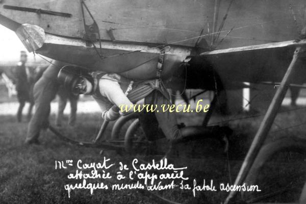 Parachutespringen  Mme Cayat de Castella attachée à l'appareil quelques minutes avant sa fatale ascension   - Tijdperk : 07/1914